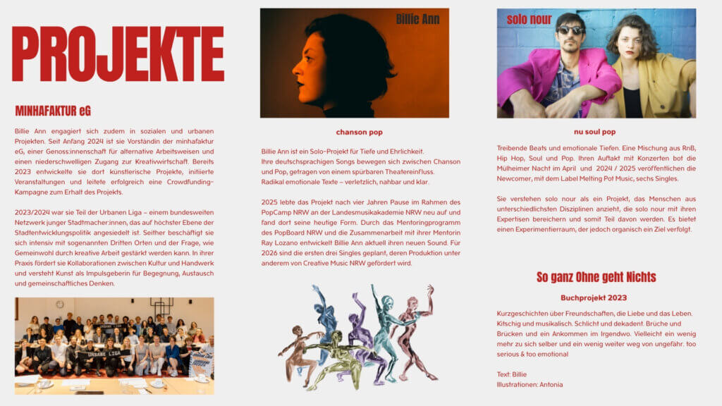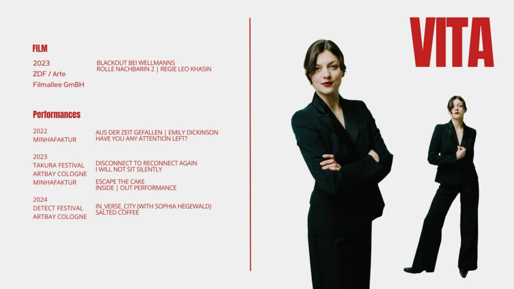 Billie Barleben ist Schauspielerin, Musikerin und Performance Artist aus Köln. Die Schauspielerei bildet den Kern ihres künstlerischen Schaffens – hier hat sie ein tiefes Erleben von Sprache entwickelt und eine besondere Liebe zum Spiel mit Worten gewonnen. Neben ihrer Arbeit an eigenen performativen Projekten erweitert sie ihr Ausdrucksfeld durch Musik und Schreiben.